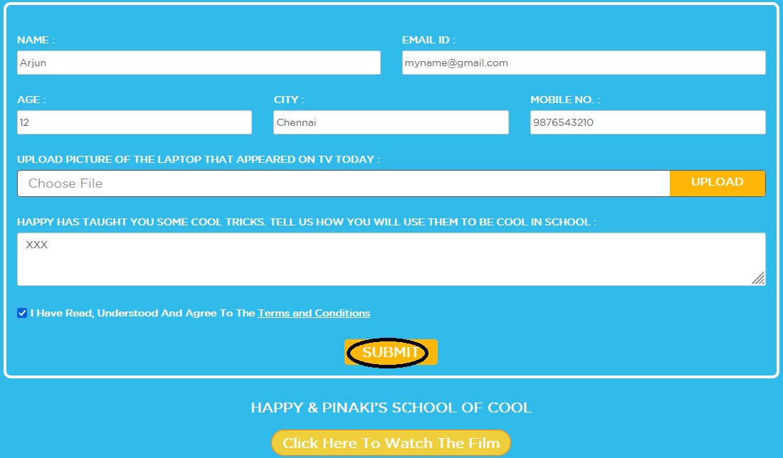 Step 4 : The Participant may also be required to provide details such as Participant’s name, age, city, contact number, email id in the form provided therein and answer such other subjective questions that may be asked therein (“Form”).