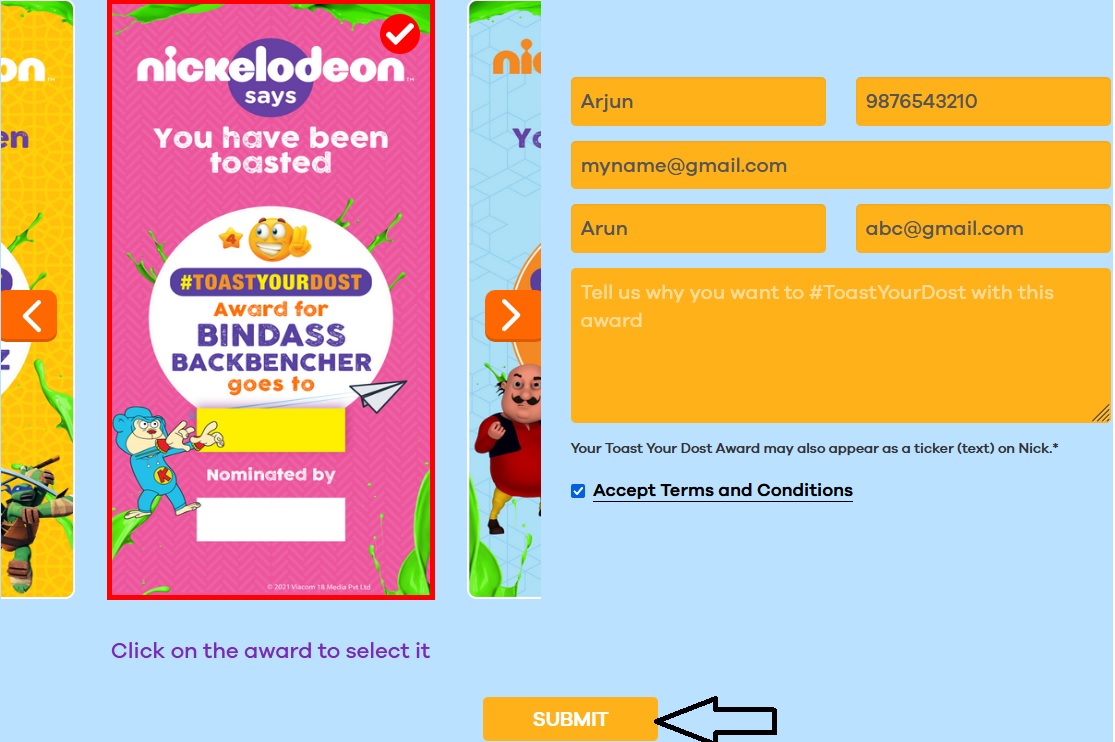 As one big ode to all the banter between friends, we thought it would be nice to award your friends with some special titles that the Nick toons put together. So go ahead, Toast Your Dost by selecting an award and entering all the relevant details.