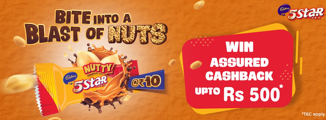 5 Star Nutty Cashback Offer 2021 is promoted by Mondelez India Foods Private Limited. Any consumer purchasing promotional product shall be eligible to receive a Voucher inside the pack. Winners will get Assured Cashback Upto Rs.500. Last date to participate in the offer is 30th November 2021.