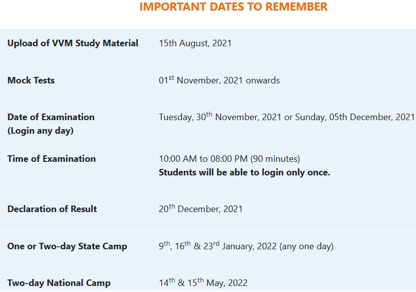 Important Dates of Vidyarthi Vigyan Manthan Talent Search Exam 2021