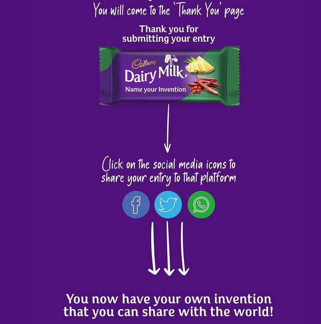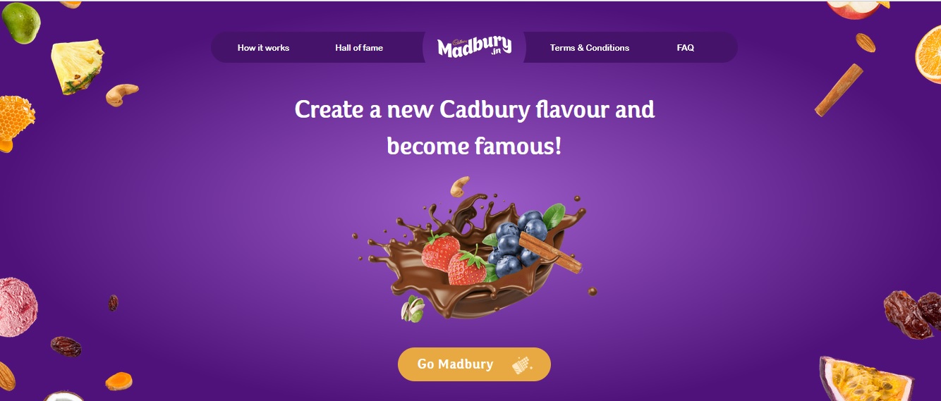 In order to be eligible for the Campaign, during the Campaign Entry Period, You must log on to www.madbury.in and create Your own Cadbury Dairy Milk bar concept by selecting from the list of ingredients available at the “Invent Your Flavor” page at www.madbury.in.