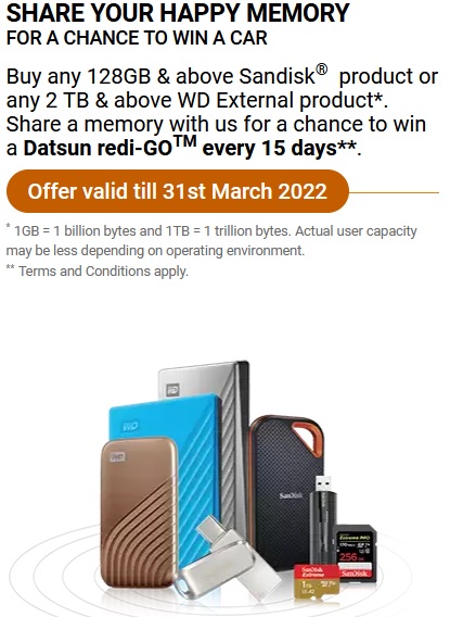 The consumer promotion “Buy, Share & Win Contest” is sponsored by Western Digital UK Limited. This Promotion is open to all people residing in India. To participate in the contest, Buy any 128GB & above Sandisk product or any 2 TB & above WD External product, Share a memory with us for a chance to win a Datsun redi-GOTM every 15 days. Offer valid till 31st of March, 2022
