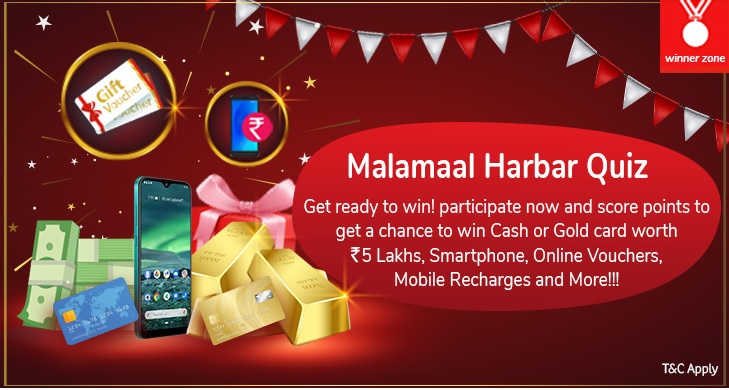 MALAMAAL HARBAR QUIZ is organized and conducted by OnMobile Global Ltd. Subscribe and participate in Airtel Players zone’s next exciting quiz Malamaal Harbar Quiz for wonderful prizes like 5 lakh rupees worth Cash Card or Gold, Monthly Online Voucher worth Rs.10000, Weekly Rs 1000 Online voucher, Recharges and more. Last date to participate in this contest is 1st March 2022.