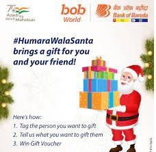 Humara Wala Santa (#HumaraWalaSanta) Christmas Contest is organized by Bank of Baroda. The contest is open to all people in India. There will be 5 lucky winners from all platforms combined. Each winner will get a Gift Card worth Rs. 500/- each for themselves & 500 for the person the tag in the contest. The contest starts on 23 December, 2021 at 10 am and ends on 31st December, 2021 at 10 pm IST.