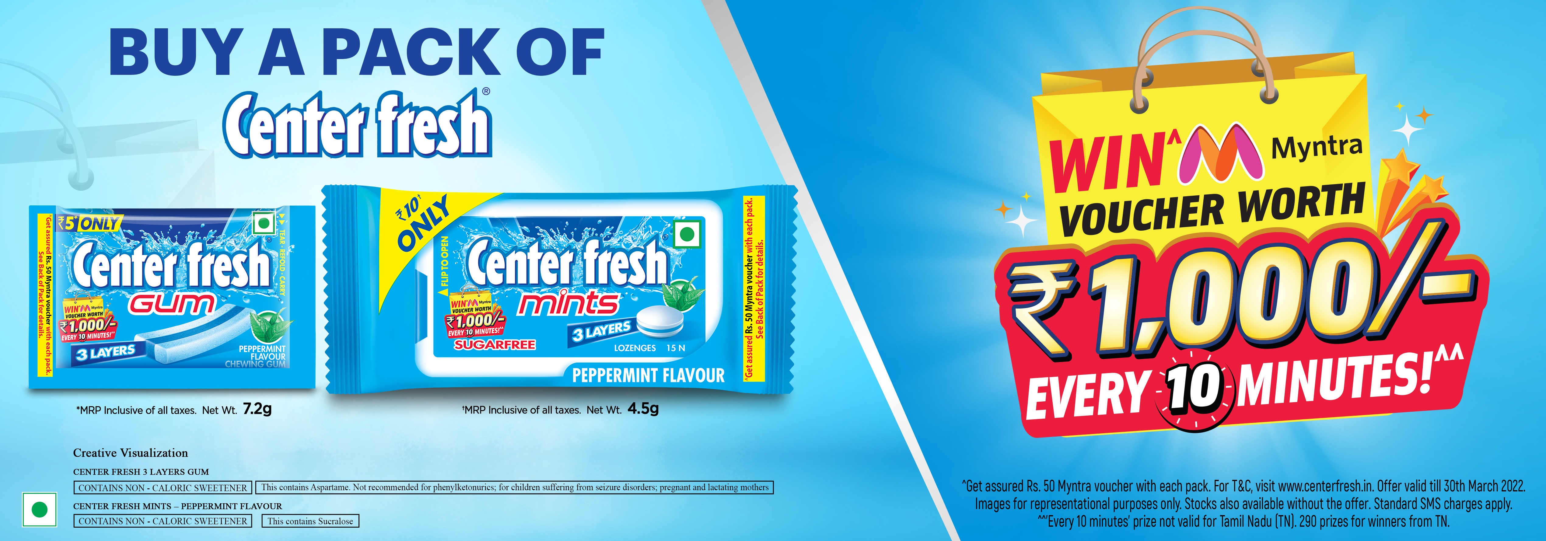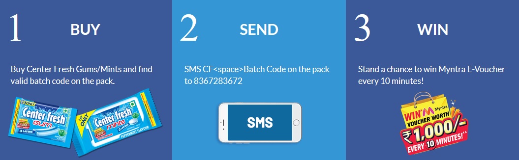 Center Fresh Myntra Consumer Benefit Contest is sponsored and launched by Perfetti Van Melle India Private Limited and conducted by Qwikcilver wherein consumers can participate by sending a SMS of Keyword<space>4 digit alphanumeric Batch Code printed on the pack of Center Fresh Mints & Center Fresh 3 Layer Gum. Contest is valid throughout India. The Contest is valid only in India from 01/02/2022 to 30/03/2022.
