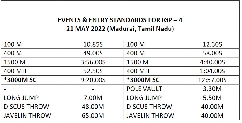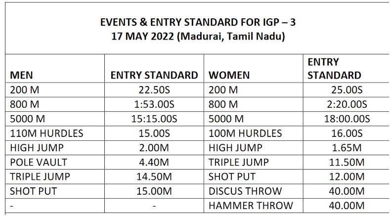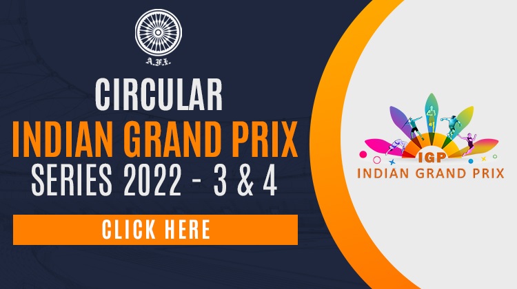 The Indian Grand Prix Series is organised by Tamil Nadu Athletics Association. Athletes who meet the enclosed Entry Standard of AFI are eligible to participate in these competitions. Minimum age to participate in this competition is 16 years. The Entry fee of INR 1000/-(non-refundable) per event will have to be deposited ONLINE only. Merit Certificates will be issued to place holders.  The last date of entries for IGP – III is 10 May 2022 & IGP – IV is 14 May 2022.