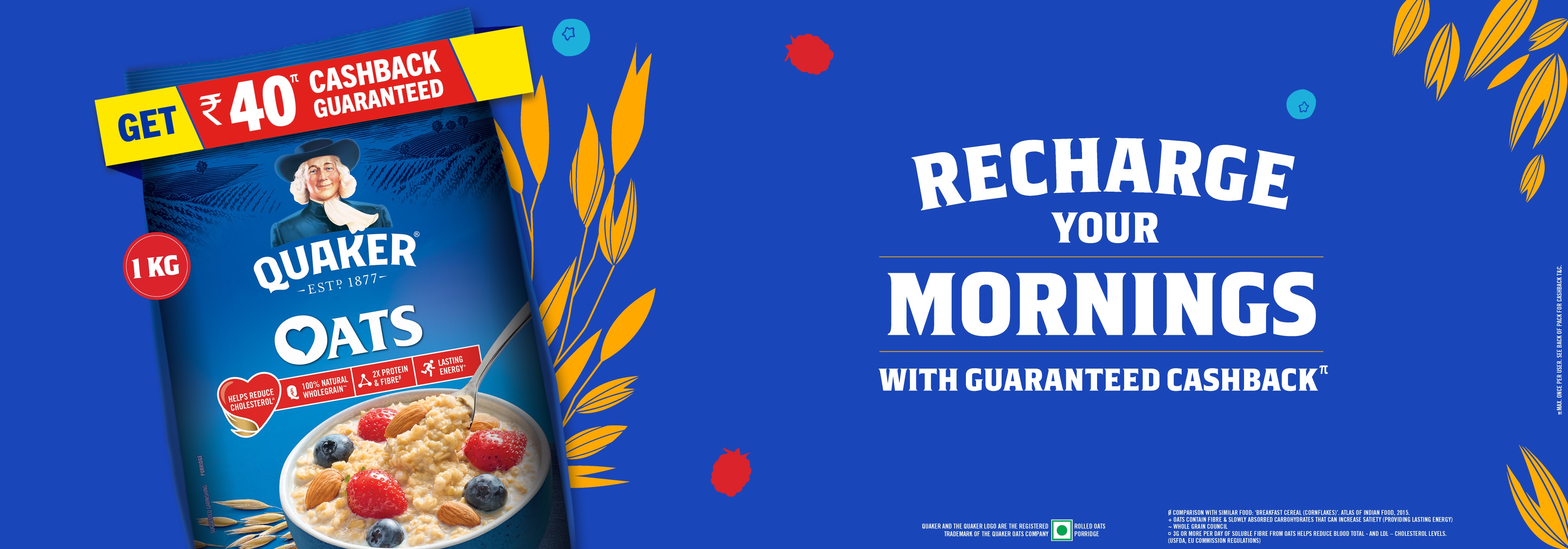 Promo is open pan India, for citizens above 18 years of age (‘Participant’). The Quaker Oats Cashback Contest is not open to