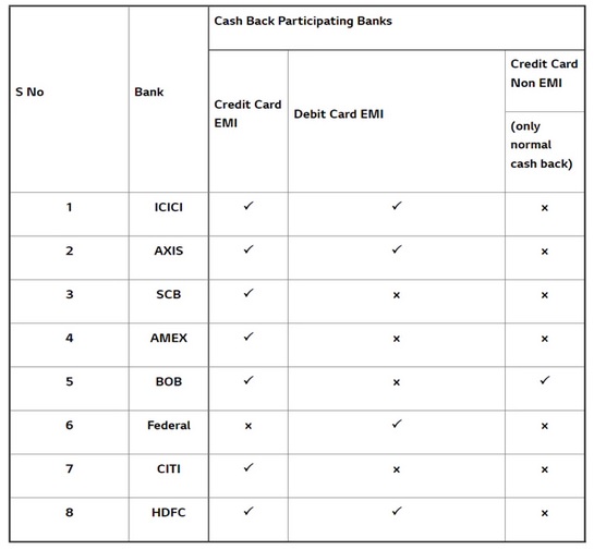 ** Cash back offer is not from LG Side and bank/finance Company is solely liable and LGEIL expressly disclaims any liability/responsibility in any manner whatsoever.