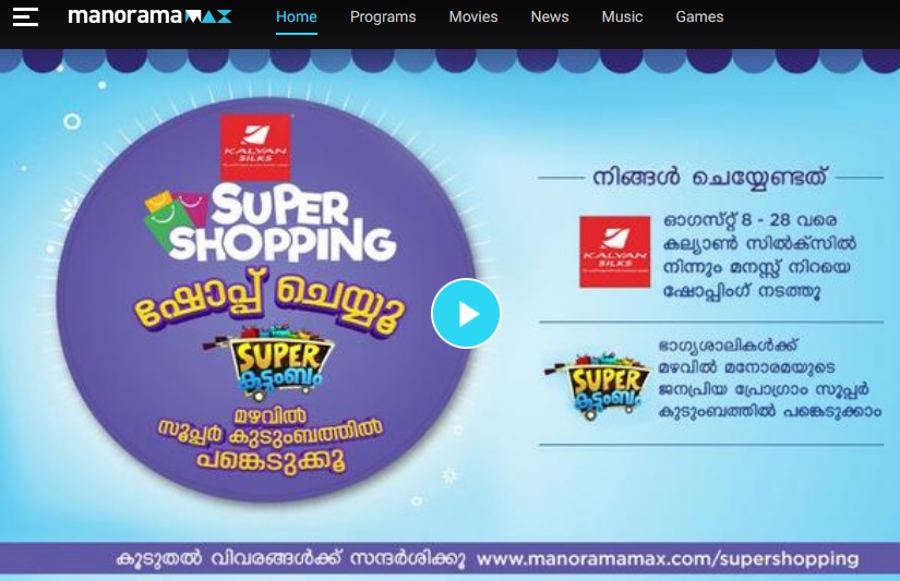 MMTV Kalyan Silks Super Shopping Contest is organised by Mazhavil Manorama Television Channel. The customer needs to share the invoice to the dedicated mobile number of MMTV provided near Kalyan Silks billing counter. The participant may share the invoice either through WhatsApp or by scanning the QR code. The 3 families (not exceeding 6 members) selected through the activity will be eligible to participate in the Super Kudumbam reality show produced by MMTV. The activity shall commence on 8 th August 2022 and end on 28th August 2022 .