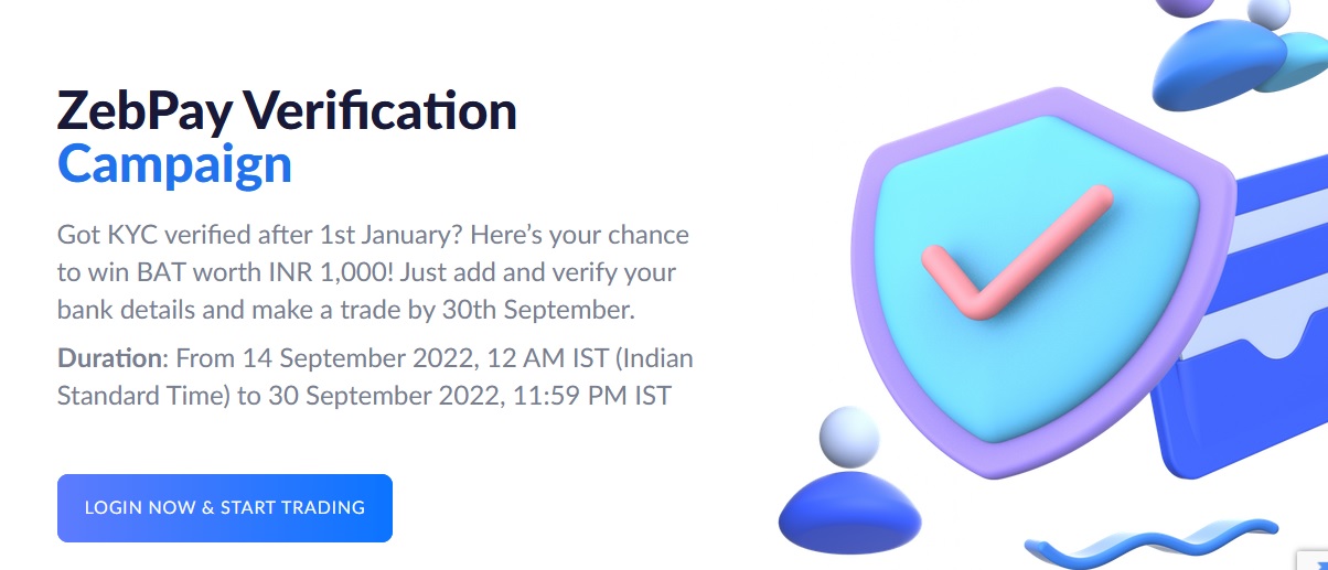 ZebPay Verification Campaign Contest is organised by Awlencan Innovations India Limited. Only KYC and Bank-verified ZebPay members can participate. If you complete verification during the offer period, you will become automatically enrolled. The ten winners will be selected who shall each win BAT worth INR 1000 in the wallet. Name of the winners will also be announced on social media. The Contest Date is 30th September, 2022.