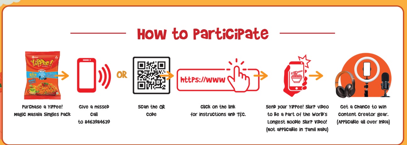 ** Entries that comply with all the Terms & Conditions will be treated as valid entries. Entries that are incomplete or not in the format specified above will be invalid. All valid entries received from Participants will feature in the final Sunfeast YiPPee! World’s Longest Noodle Slurp Video.