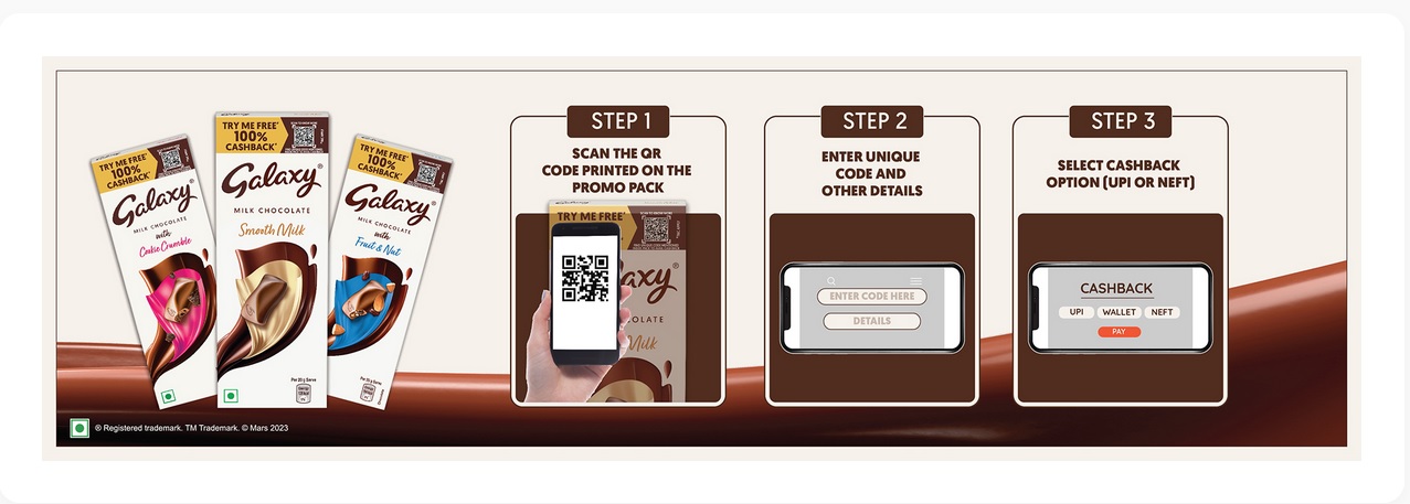 During the Program Period, cashback of Rs 80 shall be given on purchase of Galaxy Smooth Milk, Galaxy Fruit & Nut, and Galaxy Cookie Crumble prices at ₹80 by participating with unique code. Consumer will have an option to get cashback in form of NEFT or Amazon Pay code.