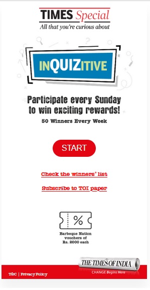 ** The participation window for each weekly quiz will be from 5 AM till 11.59 PM on the day such quiz is published in The Times of India newspaper. Entries received after the participation window will not be considered.