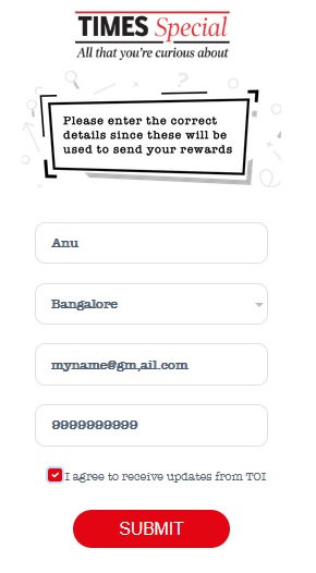 ** To participate in the Contest, the participant shall visit www.timesspecialquiz.com and correctly fill in all the details (such as, participant’s name, address, city, mobile number and email address) and answer the questions correctly by applying their minds while participating in the Contest.
