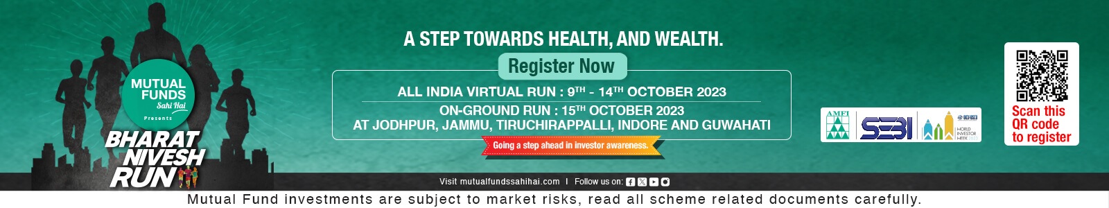 Participate in the Bharat Nivesh Run organized by Association of Mutual Funds in India under their investor awareness initiative ‘Mutual Funds Sahi Hai.’ You can choose to participate virtually from 9th to 14th October, 2023 and complete daily goals. You can also join us for the physical run on 15th October, 2023 at Jodhpur, Jammu, Tiruchirappalli, Indore & Guwahati.