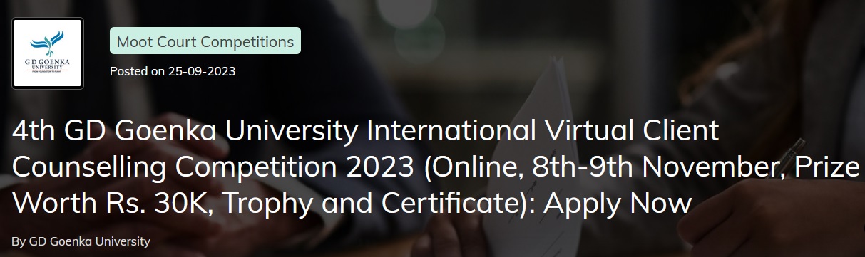Website : https://lawsikho.com/opportunities/4th-gd-goenka-university-international-virtual-client-counselling-competition-2023-online-8th-9th-november-prize-worth-rs-30k-trophy-and-certificate-apply-now