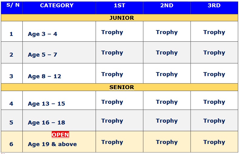 All participants will be awarded participatory certificates. Championship winners will be awarded a Certificate of Merit.