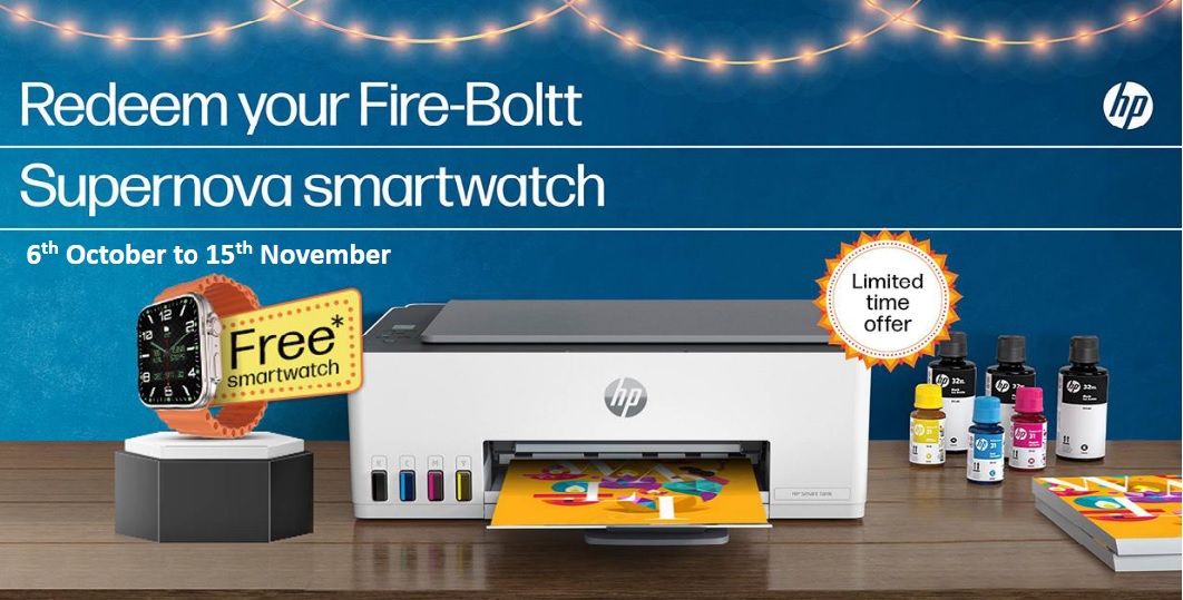 HP Smart Tank Offer 2023 is sponsored by HP. This offer is valid only for India citizens for purchases made in India. This offer is valid only on selected SKU of HP Smart Tank 580, 581, 585, 525, 520 and 521, for the purchase made between 6th October’23 to 15th November’23 to avail the Fireboltt Supernova Smart Watch. Only 1 unit of HP Smart Tank printer per invoice per customer will be eligible for redemption under this offer.