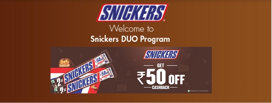 Snickers Cashback Program is sponsored and launched by MARS INTERNATIONAL INDIA PVT. LTD., conducted by Pine Labs Private Limited. The Program is open to Citizens of India only. During the Program Period, cashback of Rs 50 shall be given on purchase of Snickers Promo pack by participating with unique code. Consumer will have an option to get cashback in form of bank transfer (UPI/NEFT). The Program is valid only in India from 26/04/2023 to 30/11/2023.