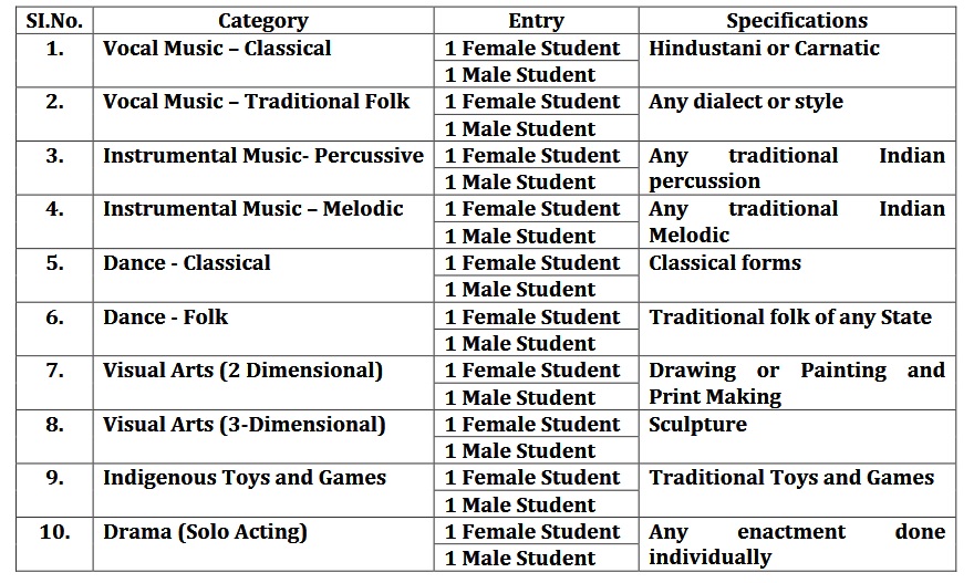 Each school can send two entries in each competition i.e one male and one female student. One student can participate in one art form only. Hence, a school can send a total of twenty entries only in the following arts.