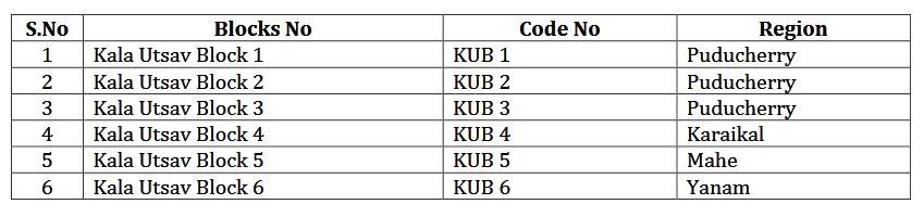 The schools are divided into 6 Kala Utsav Blocks to enhance the opportunities for participation. The Kala Utsav Block are as follows:-