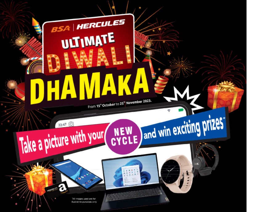 Ultimate Diwali Dhamaka Contest is organized by TI Cycles of India & BSA Hercules. Take a picture with New Cycle and win exciting prizes. Participation in the contest is restricted to only those who purchase the BSA/Hercules/Hercules Roadeo/Machcity & Montra cycles from 15th October to 25th November 2023. One cycle purchased will enable one entry in the contest . The winners will be announced at the end of every week, and will be intimated with an SMS/WhatsApp message.