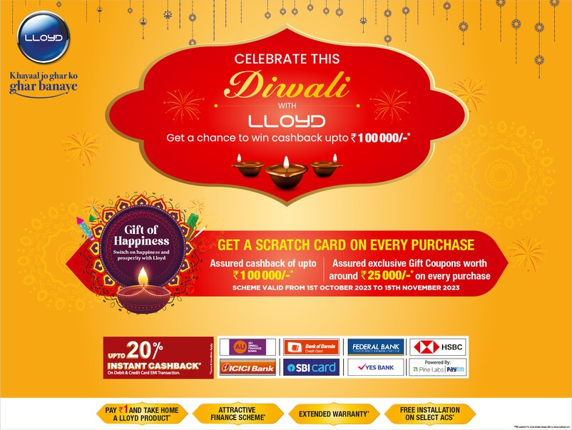 Lloyd Diwali Offer 2023 is sponsored by Havells India Ltd. The offer is applicable to purchases made PAN India except Tamil Nadu and Kerala. This offer entitles customer to a Cashback of Rs.300 up to a maximum cashback of Rs.100000/- along with Discount Offers worth around Rs.25000 in select stores. Last Date of offer is 15th November 2023.