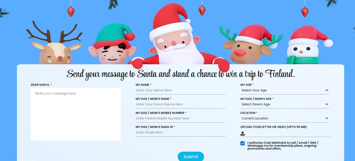 Meet the real Santa Contest 2023 is organized and managed by Club Mahindra. Send your message to Santa and stand a chance to win a trip to Finland. This Christmas, we are giving you a chance to meet the real Santa and experience a magical Christmas in Santa Village, Rovaniemi, Finland. The whole family will get to enjoy this moment of a lifetime. All you need to do is write a letter or upload your video and cross your fingers. Last Date of Contest is 31st December, 2023.