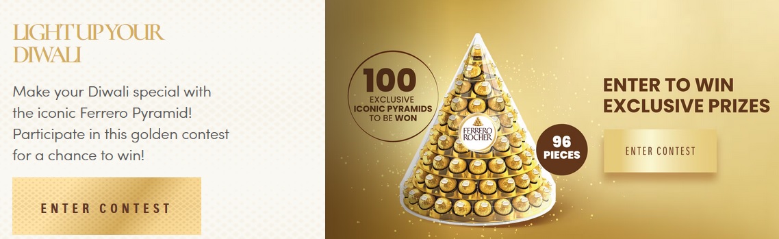 Light Up Your Diwali Contest 2023 is organized by Ferrero India Pvt. Ltd. Individual consumers residing in India only are eligible to participate in this Contest. To participate in the Contest, the Participants can either scan the QR code available on the point of sale materials or on the product packaging sleeve. Last Date of Contest is 20th November 2023.