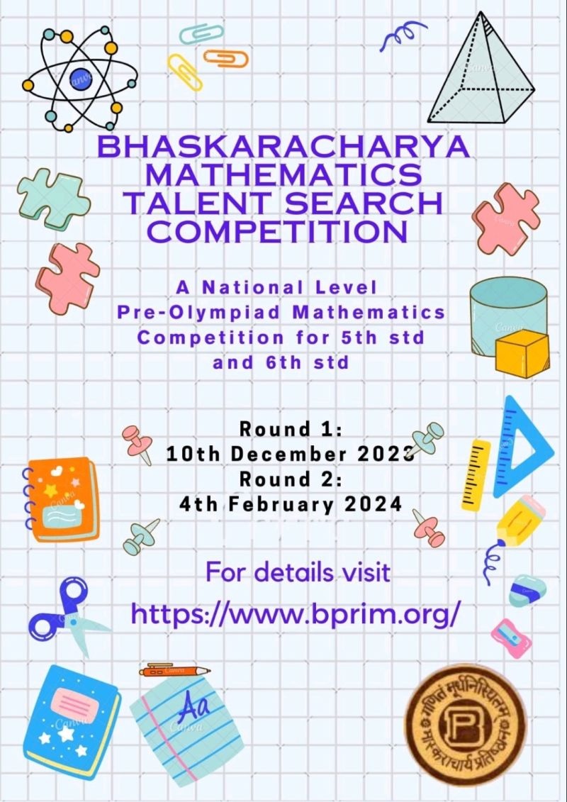 Bhaskaracharya Mathematical Talent Search Competition (BMTSC) 2023-24 is organized by Bhaskaracharya Pratishthana. This is a national level Mathematics competition for 5th and 6th standard students. Many students from the BP have gone on to win medals at the IMO. Conducting such an annual mathematics competition at the school level, is a fitting tribute to Bhaskaracharya. Last Date of Competition is 15th November 2023.