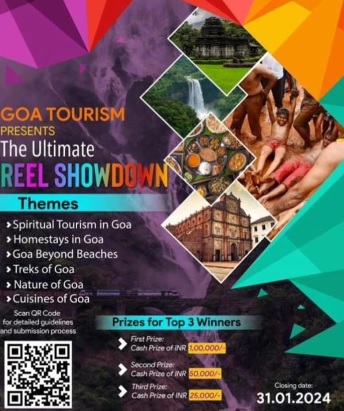 The Ultimate Reel Showdown Competition 2024 is organized by Goa Tourism Development Corporation. Open to participants of all ages. Create a 60 to 90 second Instagram Reel [ 9:16 ratio] based on the theme. Multiple entries not allowed. Ensure your content complies with Instagram’s guidelines. Winners will be announced on 10th February, 2024 on our Instagram account. Last Date of Contest is 31st January 2024.