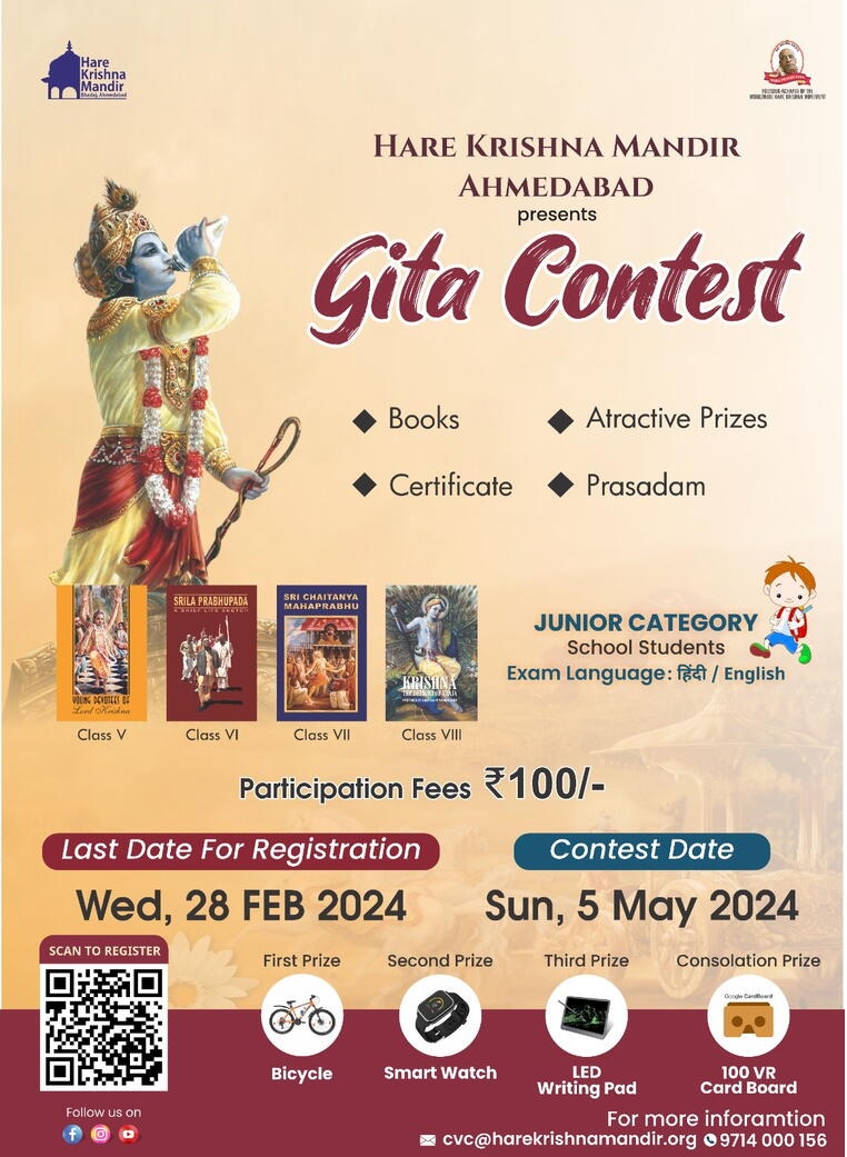 Gita Contest 2023-24 is organized by Hare Krishna Mandir, Ahmedabad. GITA CONTEST is an MCQ-based quiz contest based on Bhagavad Gita. GITA CONTEST gives a creative interface to access the unparalleled wisdom of the Bhagavad Gita and apply it in one’s life. The Hare Krishna Movement Ahmedabad is organizing a Bhagavad Gita Contest to serve this purpose. This contest will be a fun, inspiring and motivating way to help the people absorb themselves in the teachings of the Bhagavad Gita, and enrich and refocus their lives in the right manner. GITA CONTEST will be a helping hand to learn self-discipline and build a strong value system for the participants. Last date of Contest is 28th February 2024.