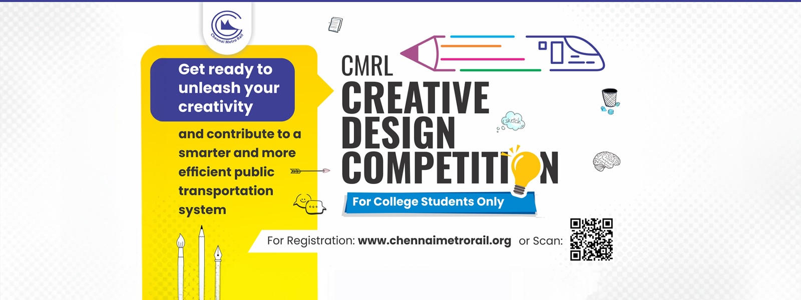 Chennai Metro Rail Limited (CMRL) invites you to participate in our Creative Design Contest 2024, an exciting opportunity to showcase your talent and contribute to the promotion of public transportation. Regular college students are only allowed to participate. Under Graduate and Post Graduate students are only allowed to participate. Only students from the same college can participate in group participation. Each participant only allowed one entry either in group or individual. Last Date of Contest is 22nd February 2024.