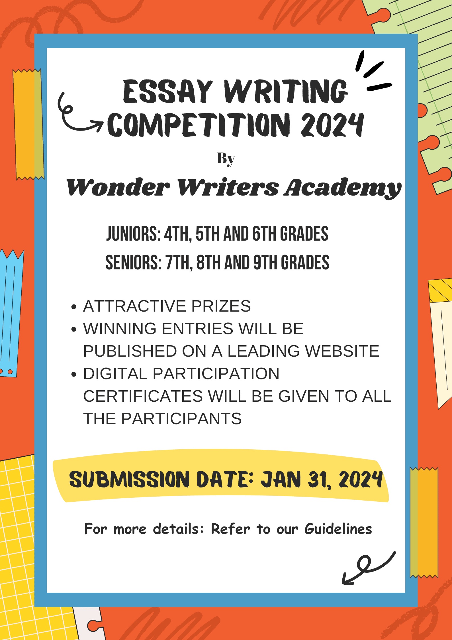 THE ESSAY WRITING COMPETITION 2024, organized and sponsored by WONDER WRITERS ACADEMY, aims to inspire creative thinking and expression among grades 4 to 9 students. Through this contest, we aim to nurture writing skills, encourage reflection, and celebrate the unique perspectives of young minds. Theme is NEW YEAR, NEW BEGINNINGS. Last Date of Contest is 31st January 2024.
