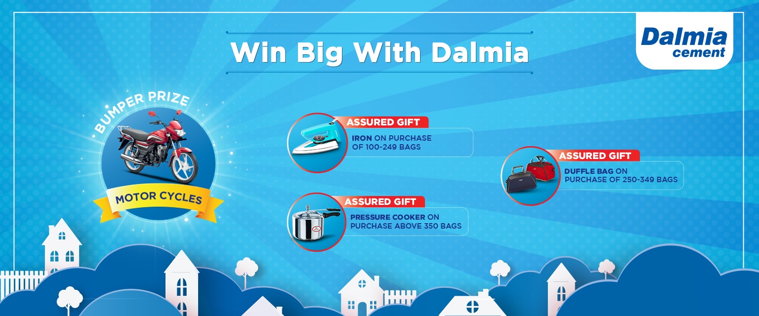 ** Upon reaching a total accumulation of 100 bags by purchase of Dalmia DSP cement during the offer period from given retailer, customer becomes eligible for assured gift. Customer will receive an SMS on his/her mobile no. regarding the delivery date of gift from the respective retailer. Customer needs to visit the retailer and collect the gift on or after the assigned delivery date (Within and not more than 15 days of receiving SMS)
