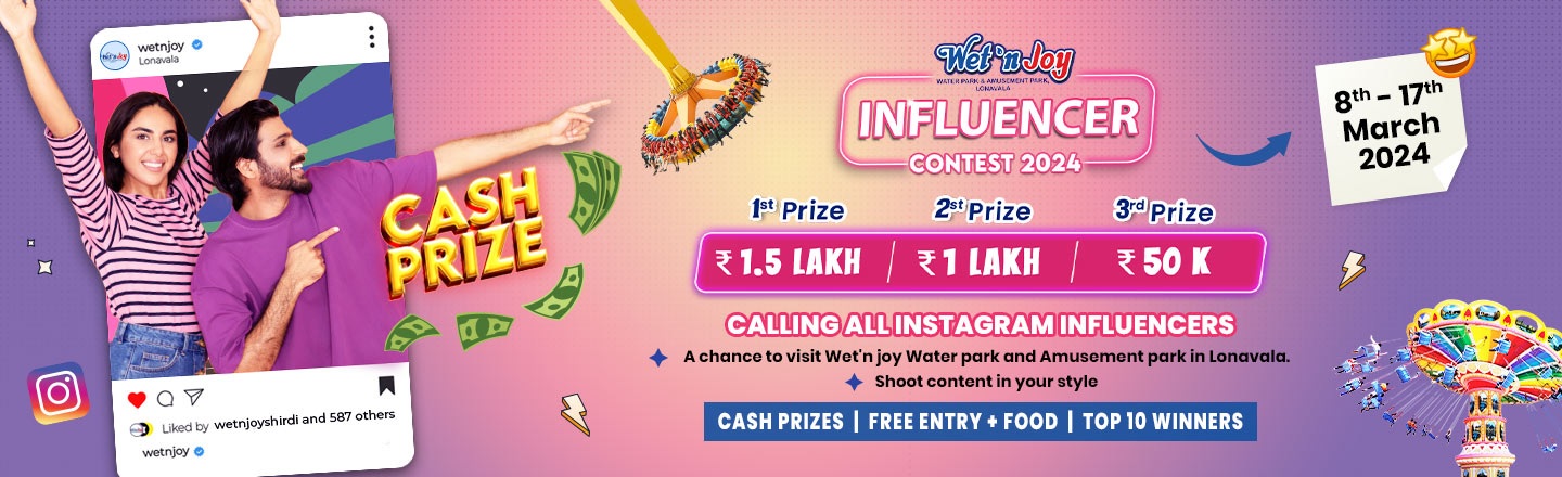 Wet’nJoy Influencer Contest – March 24′ is organized by Lonavala Park. Prepare for the ultimate social media showdown “Influencer Contest 2024”! Don’t worry : Influencers DON’T need to invite Wet’nJoy profile to collaborate on reels. Come to the park, unleash your creativity, craft captivating reels, and stand a chance to win incredible cash prizes, soaring up to Rs.3,00,000. All reels will be judged and top 10 will be selected based on creativity, effort, video clarity, editing style, and overall uniqueness. Reel/Video duration min 30 sec to 90 sec. The reel must be posted on 22nd March 2024, on your Instagram profile.
