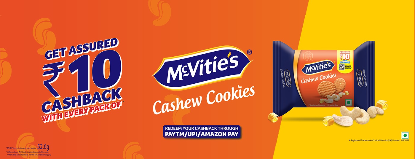 This cashback promotional offer for customers, which is sponsored and brought to you by United Biscuits India Pvt. Ltd. and conducted by RewardPort. The offer is available on multiple packs of McVitie’s Biscuits available in the market. The promotional offer is a limited period offer valid only in India subject to availability of the Products. Promotion is open to citizens of India only and people above 18 years of age. This Promotional Offer entitles the customer with cash credited in Paytm wallet/UPI/ Amazon – pay. The value of cash will be Rs 10/-. For Cashew Cookies the offer can be redeemed between May 2023 to March 2024.