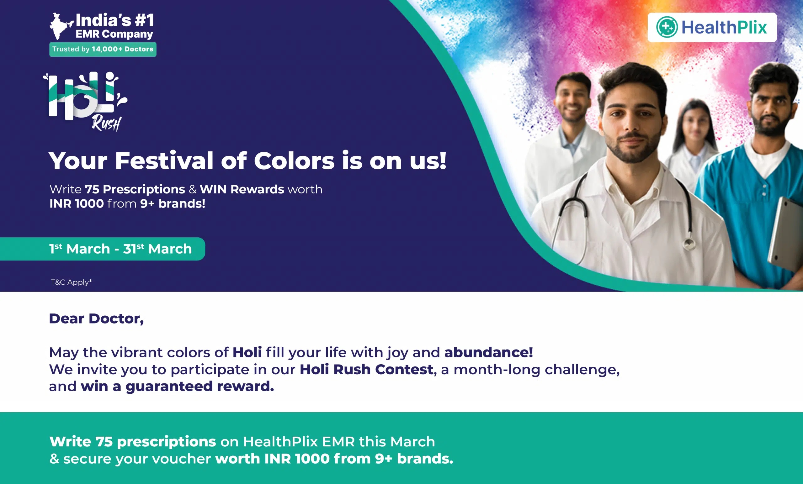 The Holi Rush Contest is an offer being run by HealthPlix to encourage doctors to explore the HealthPlix platforms better and reward them for writing Rx via the HealthPlix platform. Doctors who write digital prescriptions via HealthPlix platforms would get a chance to win exciting prizes as per the offer. This offer is only valid for users in India. Only doctors who are contacted by HealthPlix to participate in this offer will be eligible for this. Holi Rush Contest is valid from 1st March 2024 to 31st March 2024.