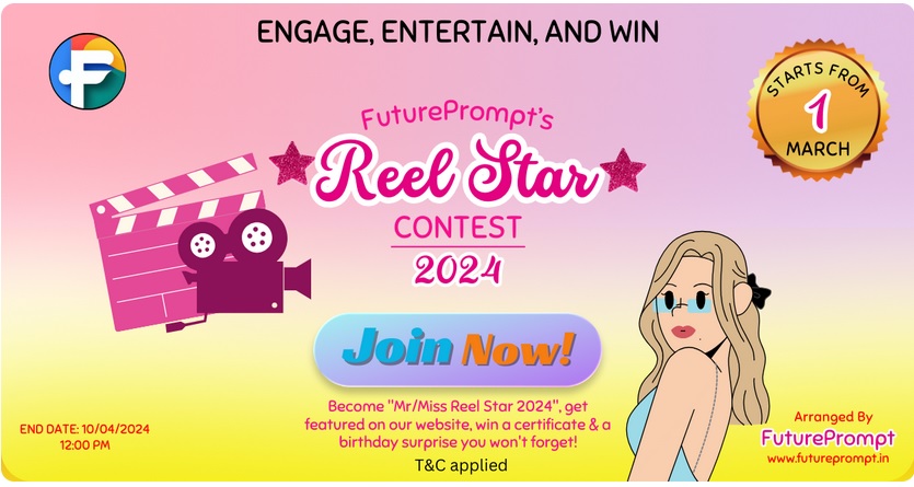 Reel Star Contest 2024 is organized by FuturePrompt. The contest will commence on 1st March and conclude on 10th April 2024. The FuturePrompt Reel Star Contest 2024 invites participants to craft captivating reels set to the beats of artists featured on FuturePrompt’s Online Artist Booking Portal. Follow the official Instagram account of FuturePrompt (@futureprompt.in ) and collaborate with the account on the reel. Multiple Entries are not allowed.