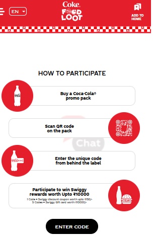 Coke Food Loot promotion is organized by Coca-Cola India Private Limited CCIPL. The Promotion shall be valid for the individuals residing in the state of Tamil Nadu only and shall be accessible upon scanning the QR code on 1L, 1.25L, 2L, 2.25L of Coca-Cola® PET packs. By participating in this Promotion, the Eligible Persons as per Clause 5 accepts and agrees to abide by these terms and conditions of the Promotion. It is hereby clarified that the Participant may participate in the Promotion multiple times, but he/she shall be eligible to win the Rs.10000/- Swiggy Gift Card only once, per Mobile number during the Promotion Period. Last Date of Contest is 28th July 2024.