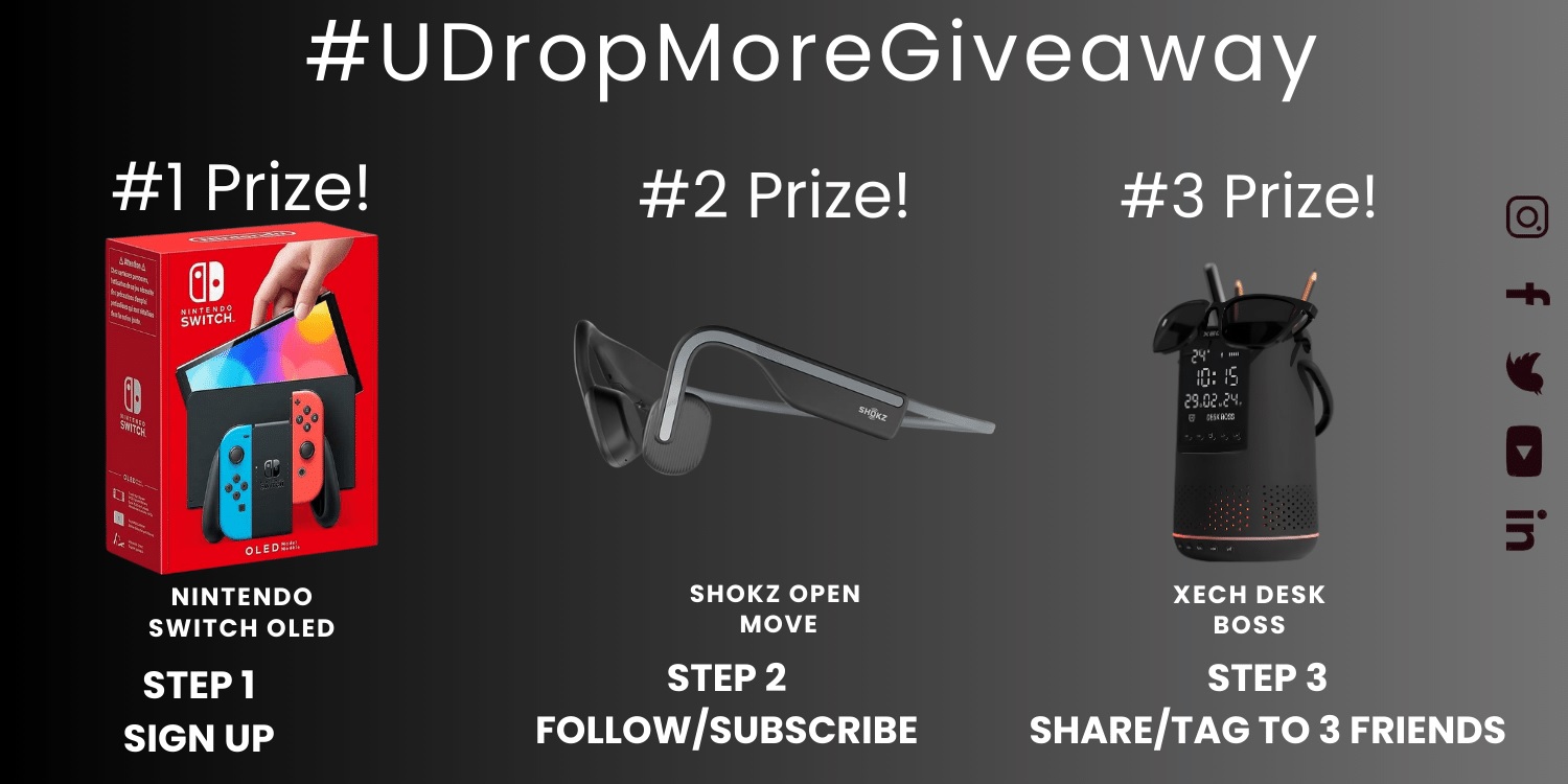 #UDropMoreGiveaway Contest 2024 is organized by UDropMore. The contest is open only for Indian nationals from India, over 18 years of age. UDropMore giveaway, a contest hosted on Instagram, Facebook, Linkedin, YouTube, and X. Participate in #UDropMoreGiveaway contest and stand a chance to win Nintendo Switch OLED, Shokz OpenMove and Xech Desk Boss. Last Date of Contest is 15th May 2024.