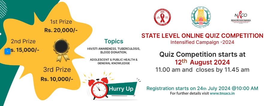6. The online Quiz competitions on above mentioned Topics will be in English , organized at the State level by Tamil Nadu State AIDS Control Society,(TANSACS) Chennai.