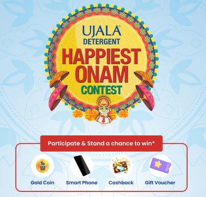 “Ujala Happiest Onam” Contest is organized by Jyothy Labs Limited. The contest is valid only in the state of Kerala. This contest is open for adults above 18 years. Customers of Ujala Detergent Powder can participate by scanning a QR Code printed on the specially marked promo packs of Ujala Detergent Powder range of products. Participant can win a Cashback or Smartphone or Gold Coin. Last Date of Contest is 12th October 2024.
