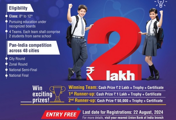 U Genius 3.0 National Level General Awareness All-India Quiz Competition 2024 is Organised by Union Bank of India. The contest is open to all the Class 8th to 12th Students in India. Participants should bring their school photo identity cards/ bonafide certificate from the school with photograph. There is no Entry fee. Last Date of Contest is 22nd August 2024.