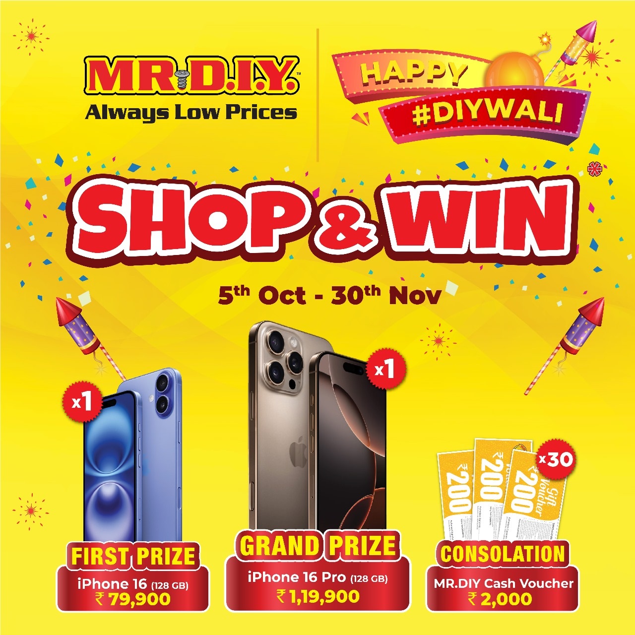 Prize : iPhone 16 Pro 128GB, iPhone 16 128GB, and 30x MR.DIY Cash Vouchers worth ₹2,000!