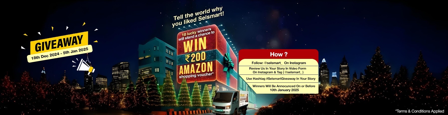 Selsmart Giveaway Contest 2025 (#SelsmartGiveaway) is organised by Selsmart. The contest is open to all individuals who are residents of India and are registered on selsmart.in. Post a story in video form on Instagram tagging @selsmart_ to participate in the contest. Each of the 10 winners will receive an Amazon shopping voucher worth INR 200. Last date of contest is 5th January 2025.