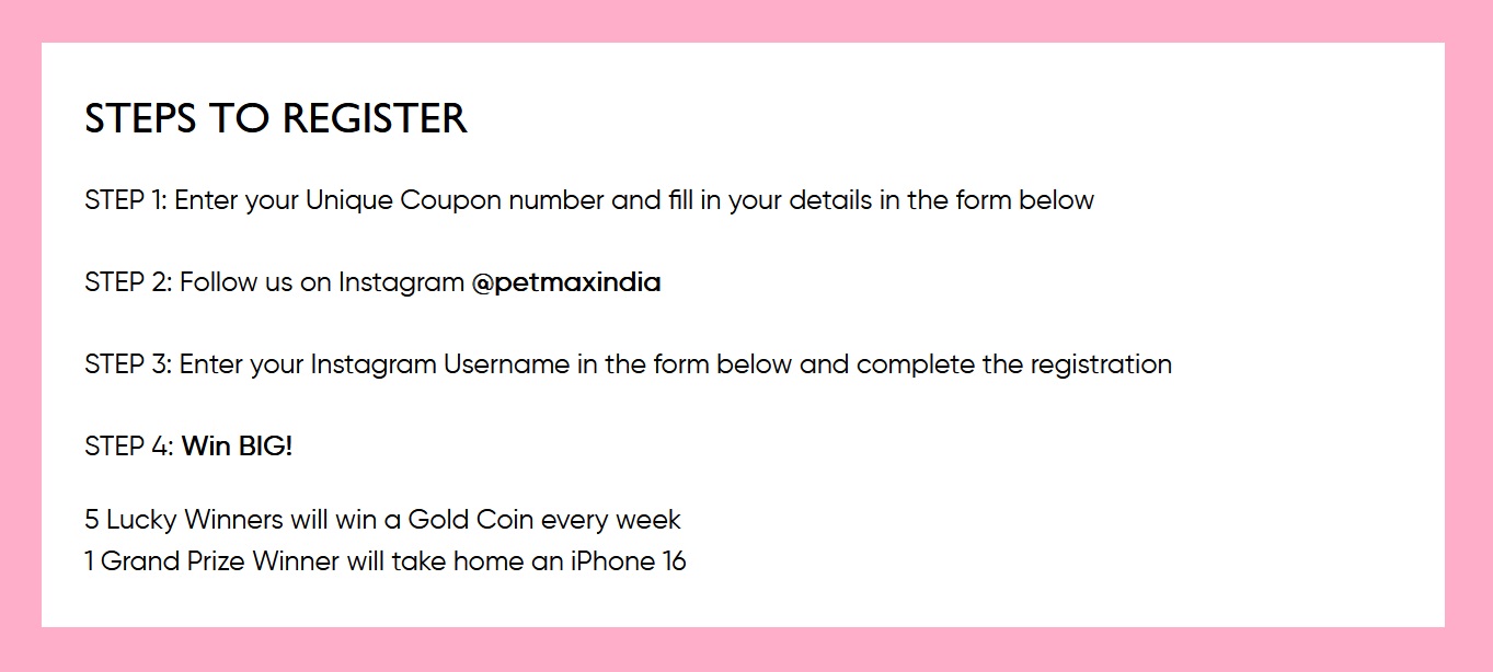 ** Follow PetMax on Instagram @petmaxindia, mention your Instagram username in the registration form and click on the submit button to complete the registration.