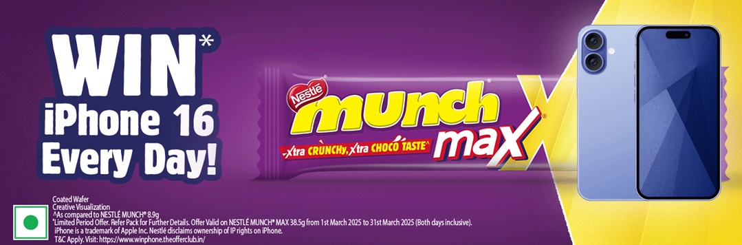 Nestle Munch Max Contest 2025 is launched by Nestlé India Limited. Participants must be citizens of India and must reside in India. This Program is valid in India. Participation(s) can submit a maximum of 3 entries during the Program Period but can win only once. No charges are payable to Nestlé India or the organizers for participation in or winning the Program. Participants will get a chance to win iPhone 16 (128 GB). Last date of contest is 31st March 2025.