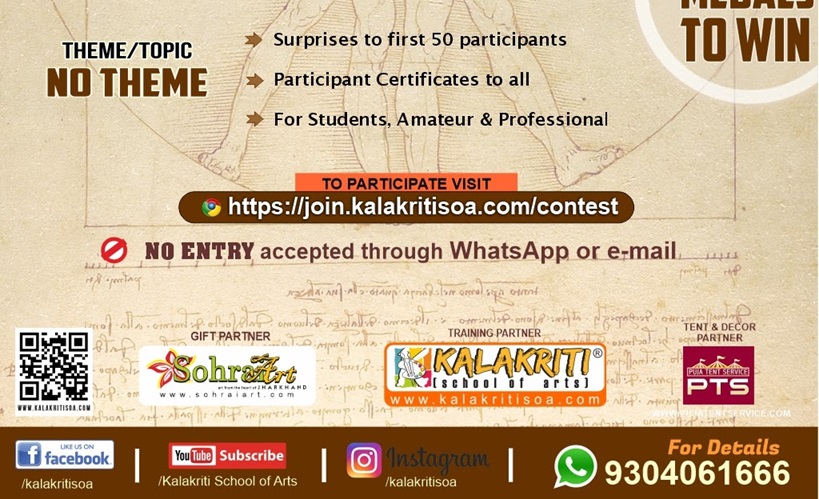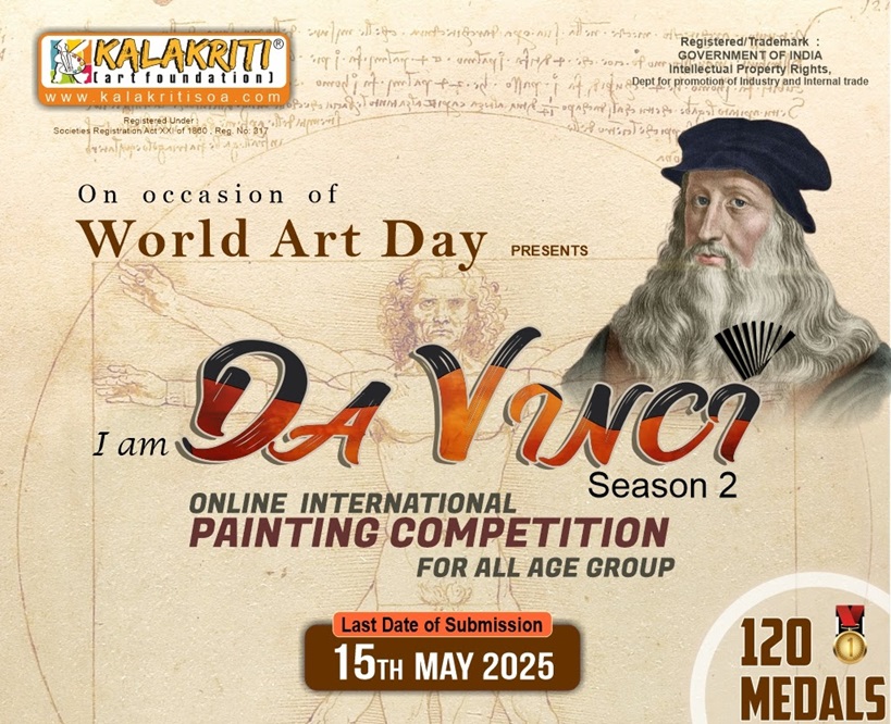 On the occasion of World Art day 2025 on birthday of world Leonardo da Vinci through your creativity. So under the aegis of Kalakriti Art Foundation, an online art competition is being organized on this occasion. Obviously, the theme of all the artistic creations have to be situated within the Country, and also the entries can come from anywhere in the world. Any one above 3 years can participate in 4 different categories. Last Date of application is 15th May 2025.