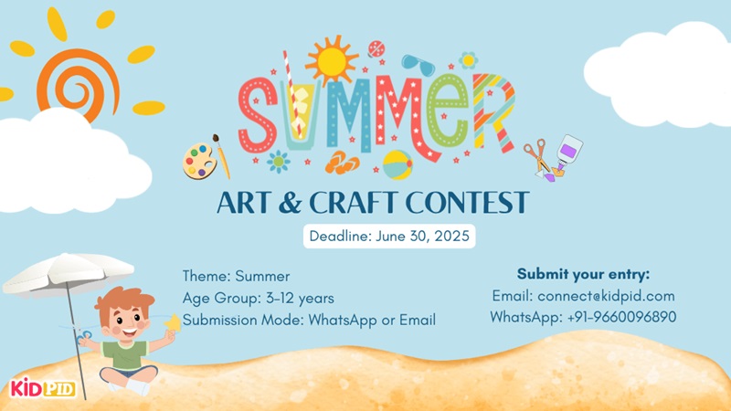 Summer Art & Craft Contest 2025 is organised by Kidpid. Theme is Summer. Children aged 3 to 12 years can enter in this contest. Submission Mode is WhatsApp or Email Entry. No Entry Fee for the First 100 Participants! Participate and win Certificate and Kidpid Gift Hamper. All participants receive a colorful E-Certificate of Participation. Last Date of Contest is 30th June 2025.